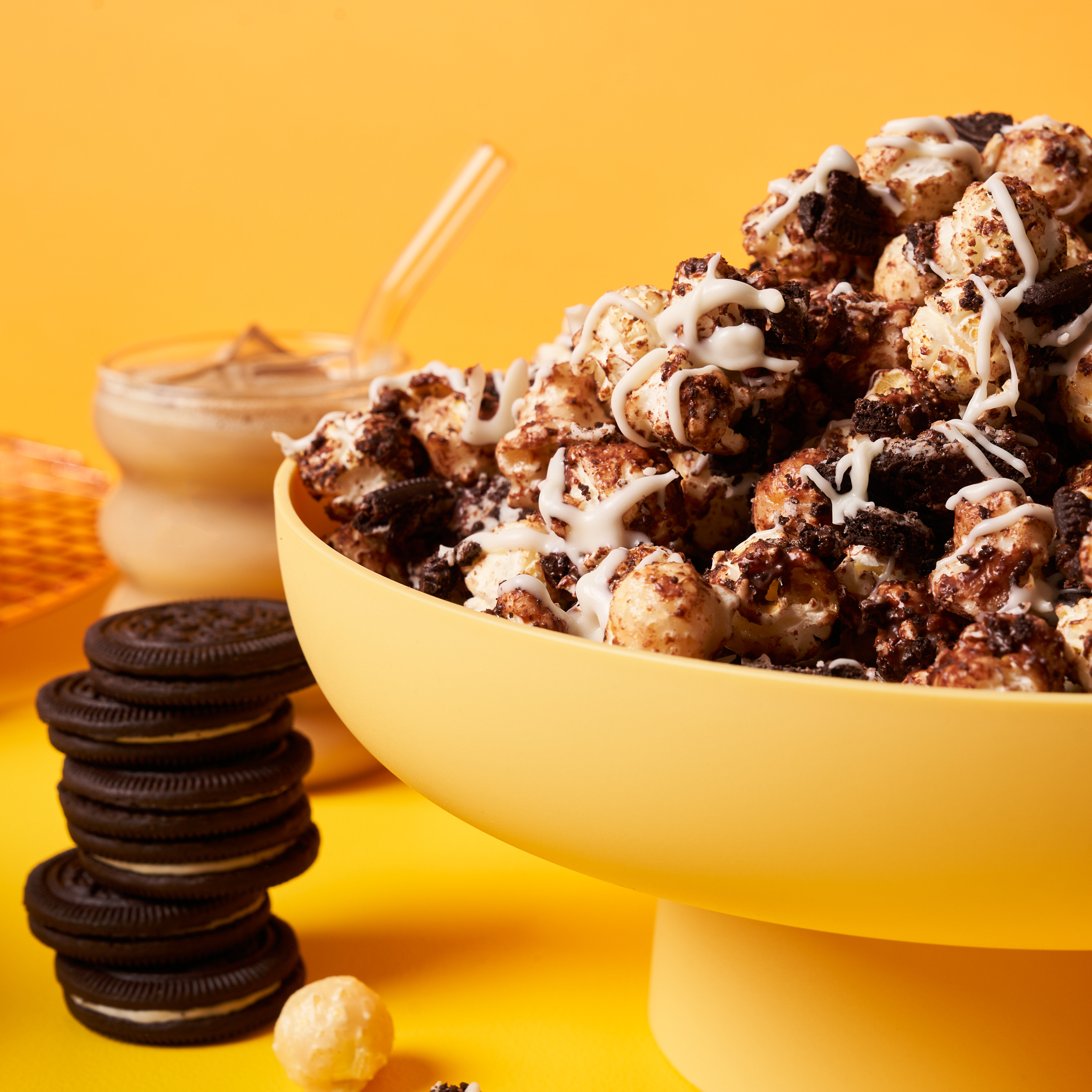 Smartfood® Sweet & Salty Kettle Corn coated with crushed chocolate cookies and drizzled with semi-sweet chocolate and white chocolate to make a sweet & salty snack for all your parties this season!